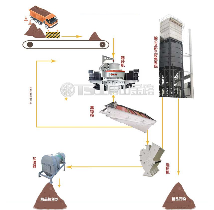 物料首先從原料倉經(jīng)過電子秤進入到皮帶輸送機中,再由提升機將物料入到制砂機內進行破碎處理,破碎后的物料進入高頻篩中進行篩分,篩分后的較大物料會返回制砂機內進行二次破碎,符合要求的砂子則會進入選粉機中進行選粉處理,產(chǎn)生的粉塵會經(jīng)由粗細粉分離機進入到布袋收塵器。最后,篩分選粉合格的產(chǎn)品會進入加濕拌合機進行加水處理,防止機制砂在運輸過程中產(chǎn)生離析或揚塵。